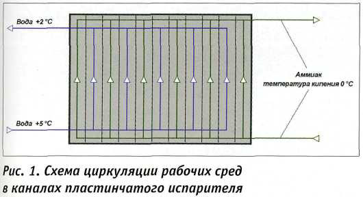 Наиболее распространенным способом получения ледяной воды (с температурой 1.52°С) в настоящее время является охлаждение воды в пластинчатых испарителях. Конструкция пластинчатого испарителя представляет собой набор гофрированных каналов, по которым циркулируют кипящий хладоноситель и охлаждаемая вода. Существует множество различных вариантов циркуляции рабочих сред внутри пластинчатого испарителя, которые обусловлены требованиями к распределению потоков в каналах, потерям давления, турбулентности течений и рядом других. Но основной схемой, отображающей особенности функционирования пластинчатого испарителя можно назвать схему, приведенную на рис. 1.