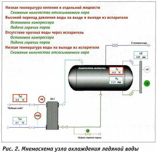 На рис. 2 приведена мнемосхема узла охлаждения ледяной воды, на которой красными контурами выделены элементы, связанные с параметрами, подлежащими контролю и регулированию.