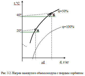 При достаточно большом количестве сорбента можно считать, что воздух, находящийся с ним в контакте, принимает относительную влажность, соответствующую равновесной влажности сорбента. Процессы нагрева и охлаждения воздуха в замкнутом объеме при этом идут практически по линии const (вверх при нагреве и вниз при охлаждении). Сорбент выполняет роль стабилизатора влажности.