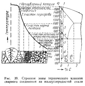 Сварное соединение можно разделить на три основные зоны, имеющие различную микроструктуру: зону основного металла, зону термического влияния и зону наплавленного металла сварного шва. При газовой сварке вследствие более медленного нагрева зона термического влияния (околошовная зона) больше, чем при дуговой. Зона термического влияния имеет несколько структурных участков, вызванных температурой нагрева в пределах 450—1500°С и отличающихся между собой формой и строением зерна. Зона термического влияния (рис. 39) состоит из следующих участков: 1 — неполного расплавления, 2 —перегрева, 3 — нормализации, 4 — неполной перекристаллизации, 5 — рекристаллизации и 6 — синеломкости.