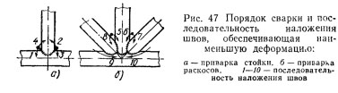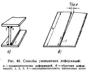Для уменьшения деформаций применяется также способ уравновешивания деформаций, при котором имеет значение очередность наложения швов. Очередность наложения выбирают так, чтобы последующий шов вызывал деформации, обратные деформациям, полученным при наложении предыдущего шва. При наложении шва (рис. 46, а) листы деформируются в одну сторону, а при наложении шва 2—в противоположную. В результате двутавр будет иметь наименьшую деформацию.