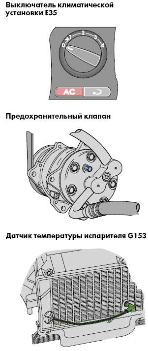 Система также оснащена датчиком температуры, расположенным на испарителе, для мониторинга его температуры. Данные с датчика поступают в блок управления климатической системой, что позволяет автоматически отключать компрессор при падении температуры испарителя ниже определённого порога (примерно от −10°C до 0°C) для предотвращения обледенения за счёт замерзания конденсата. Система вновь активируется, когда температура повышается до примерно +3°C. В некоторых вариантах системы используется термовыключатель для прямого отключения питания электромагнитной муфты или другие регуляторы, включая термовыключатель, реагирующий на температуру наружного воздуха.