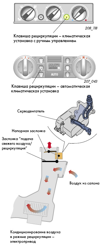 В системах кондиционирования с ручным управлением режим рециркуляции воздуха активируется по усмотрению водителя. Эта функция позволяет пользователю самостоятельно решать, когда следует переключить систему на рециркуляцию, чтобы повторно использовать уже охлажденный или нагретый воздух в салоне автомобиля. В системах с ручным регулированием за перемещение заслонок отвечают вакуумные сильфоны, активируемые нажатием соответствующей кнопки. В автоматических климатических системах включение режима рециркуляции также часто требует ручного вмешательства, хотя здесь для управления заслонкой «подача свежего воздуха/рециркуляция» используется электрический серводвигатель. Это обеспечивает более точное и надежное управление переключением между режимами.