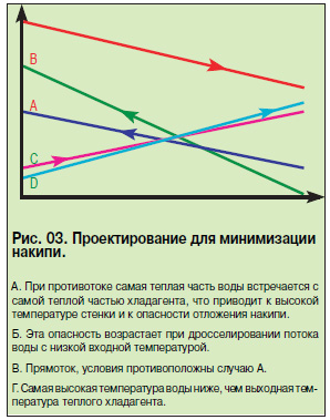 Рекомендация 3. Обдумайте использование прямотока вместо противотока. В этом случае на участке с максимальной температурой охлаждаемой среды, т.е. на входе, эта среда будет контактировать с наиболее холодной охлаждающей средой. Обычно это обеспечивает более низкую максимальную температуру стенки со стороны охлаждающей воды и автоматически ограничивает ее выходную температуру, см. рис. 03.