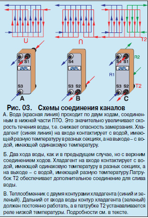 ППТО со сдвоенными контурами хладагента В «Конструкция и монтаж» описывались три возможных схемы теплообменников с двумя контурами хладагента. Одна из этих схем, показанная на рис. 3В, имеет тот недостаток, что при отключении одного из контуров хладагента выходящая из теплообменника вода представляет собой смесь охлажденной и не охлажденной воды. Если температура этой смеси регулируется, например, изменением температуры испарения, это может привести к тому, что температура охлаждаемой воды опустится ниже нуля, хотя выходная температура будет выше нуля. С другой стороны, достоинство такой схемы в том, что она применима для ПТО любого типа, паяных или разборных. Для безопасного применения данной схемы нужно принять следующие меры. - Установить в патрубке Т2 реле низкой температуры, которое отключает компрессор при слишком низкой температуре воды. Это реле будет контролировать температуру воды на выходе из секции R2.