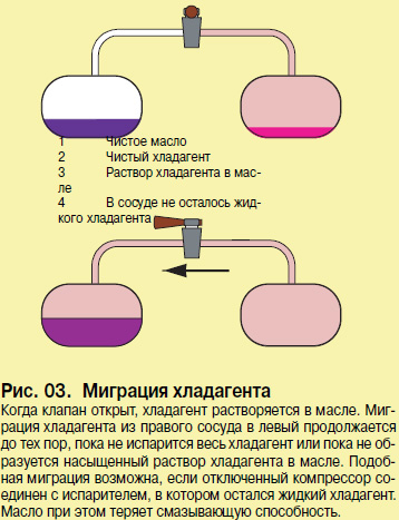 Миграция пара. Если пар хладагента контактирует с чистым растворимым маслом, он будет растворяться в нем. Если количество хладагента достаточно велико, масло постепенно будет разбавлено, см. рис. 03.