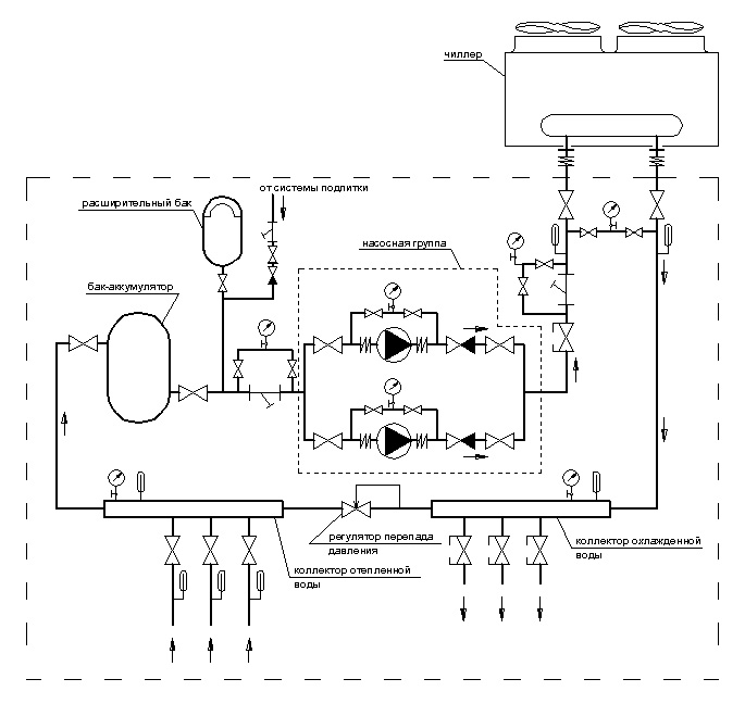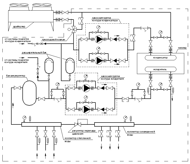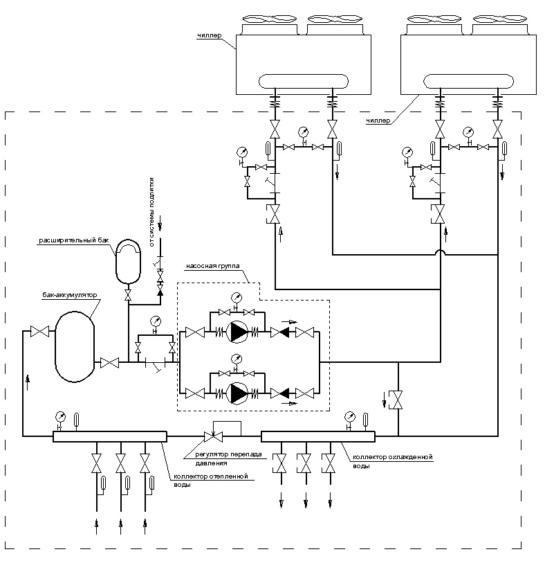 Схема системы с чиллером наружной установки Система холодоснабжения с одним наружно установленным чиллером и осевыми вентиляторами представляет собой одно из самых распространенных и простых решений в этой области. Обычно в качестве теплоносителя используется вода, хотя в определенных условиях возможно применение теплоносителей с низкими температурами замерзания, таких как раствор этиленгликоля или рассолы. Циркуляция теплоносителя в системе осуществляется при помощи насосной группы. В рассматриваемом примере насосная группа состоит из двух насосов: основного и резервного. Компоненты системы - Расширительный мембранный бак: Этот элемент не только предотвращает гидравлические удары при работе насосов, но и компенсирует изменение объема теплоносителя из-за колебаний его температуры.