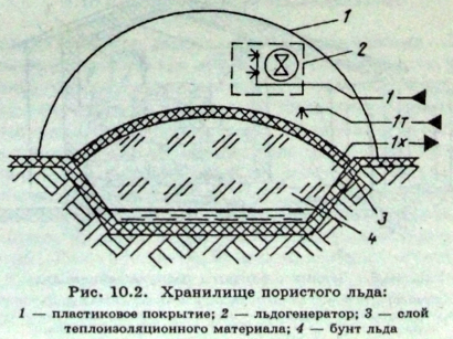 Пористый лед намораживают в заглубленном в грунт и изолированном от атмосферного воздуха сооружении, которое имеет несущую металлическую конструкцию (например, арочного типа), легко открывающуюся наружную ограждающую конструкцию (например, из пластика), оснащенном льдогенератором, системами подачи теплой и отвода холодной воды (рис. 10.2). При понижении температуры наружного воздуха до −2°С начинают намораживать лед. Для этого открывают участки покрытия 1 из пластика, ближайшие к зоне намораживания, для подачи холодного воздуха. С помощью льдогенератора 2 получают поток гранул льда небольшого размера 0,1-0,5 мм, которые смерзаются на поверхности бунта 4. Полученный в результате такого намораживания бунт покрывают теплоизоляцией 3. Количество намороженного льда зависит от необходимой тепловой нагрузки и потерь льда.