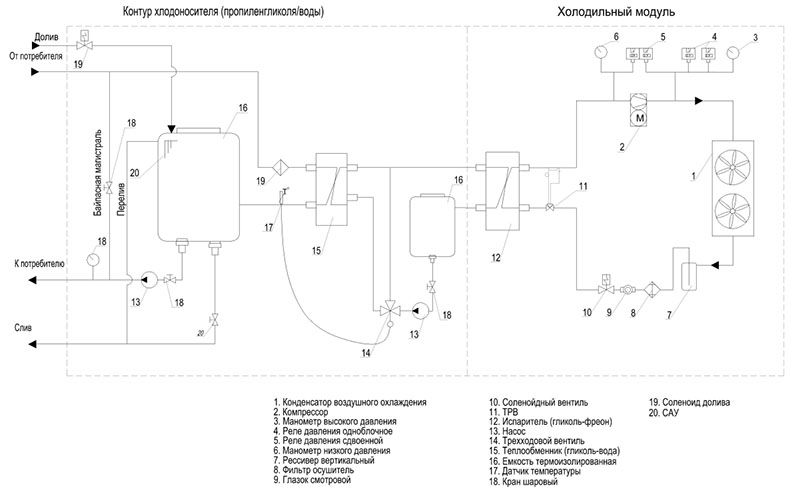 В рамках двухконтурной схемы, рабочая жидкость циркулирует во внешнем контуре, перемещаясь от испарителя к теплообменнику. Этот тип схемы находит свое применение в объектах, которые функционируют круглый год, где во внешнем контуре «чиллер-теплообменник» используется антифриз, а во внутреннем «теплообменник-потребитель» — обычная вода.