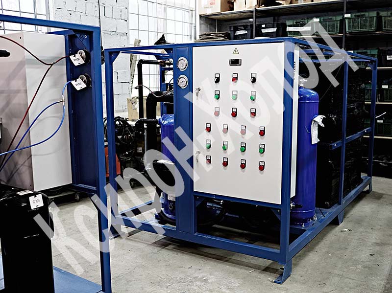 На фото щит управления чиллером В результате в регуляторе СеВеР был исключен режим полной остановки вентилятора, и был выбран следующий алгоритм работы: после 5 секунд работы на максимальных оборотах, вентилятор переключается на минимальную скорость (не более 2% от номинальной мощности), пока температура конденсации хладагента не достигнет +30°С. Микропроцессорное управление позволяет минимизировать напряжение на обмотках вентилятора, предотвращая его выход из строя. В диапазоне температур +30°С до +40°С поддерживается стабильное состояние, а выше +40°С вентилятор работает на максимальных оборотах. В режиме «тепло» вентилятор также работает на максимальной скорости.