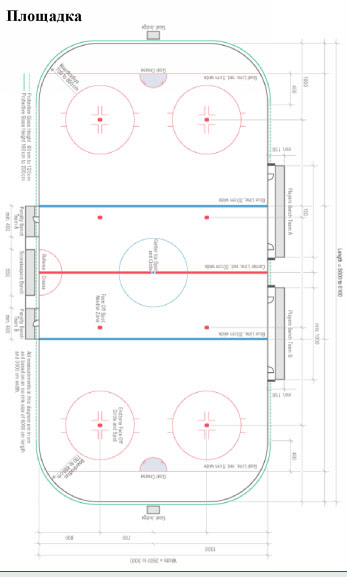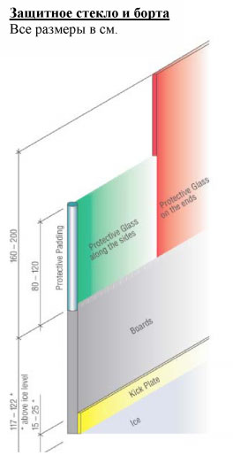 - Вдоль лицевых сторон устанавливается защитное стекло высотой 160-200 см, продолжающееся по бокам до нейтральной зоны на 4 м от ворот, что способствует безопасности игроков и зрителей.