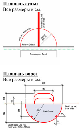 В области ворот нанесены красные точки для вбрасывания диаметром 60 см, вокруг которых проведены круги с радиусом 4,5 м для организации вбрасываний в зоне атаки и обороны.