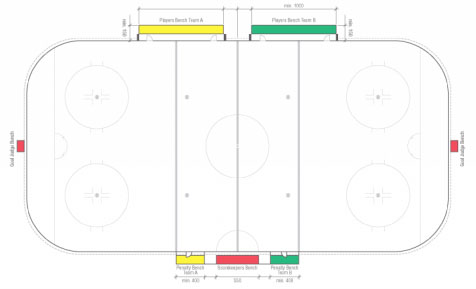 Между местами для оштрафованных игроков находится место для судей длиной 5,5 метра, рассчитанное на размещение до 6 человек.