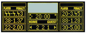 - На табло отображаются названия команд, текущее время игры, оставшееся штрафное время, счет, время тайм-аута и перерыва.