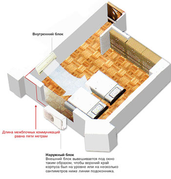 Монтаж наружного блока также должен осуществляться с учетом определенных требований: - укрепляя наружную часть устройства, следует подумать о ее защищенности — чтобы на внешний блок не могло ничего упасть сверху. Лучшим предохраняющим средством в этом случае зачастую служат балконы. Однако если балкона нет, необходимо соорудить для устройства нечто наподобие козырька. В случае установки наружного блока на горизонтальной поверхности, например на крыше, желательно позаботиться о том, чтобы его зимой не задувало снегом;