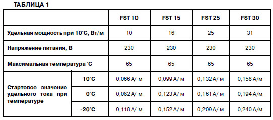 Для изготовления нагревателей наружного типа используют греющий кабель марки FST. Он представляет собой полупроводниковый материал, внутри которого проходят две параллельные жилы. При увеличении температуры его тепловая мощность и проводимость уменьшается.