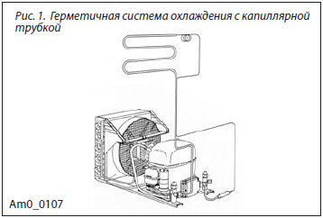 На рисунке 1 показана герметичная система охлаждения с капиллярной трубкой в качестве расширительного устройства. Системы охлаждения этого типа используются в большинстве домашних и маломощных торговопромышленных холодильников, фризерах для мороженного и охладителях напитков.