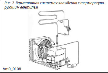 На рисунке 2 показана герметичная система охлаждения с терморегулирующим вентилем. Системы этого типа, в основном, используются в торгово-промышленных холодильниках.
