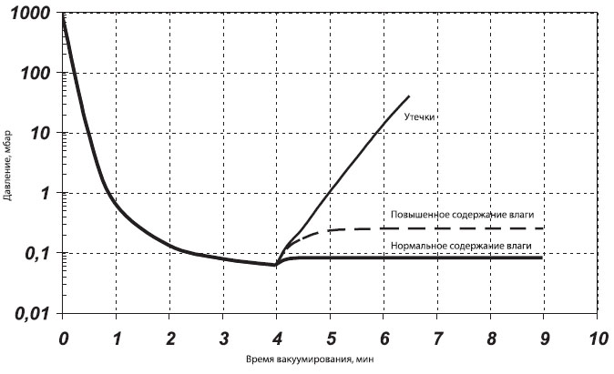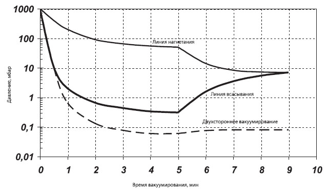 На рисунке внизу показана типичная кривая изменения давления при одностороннем вакуумировании системы через служебный штуцер компрессора. На нем также показана разность давлений, измеренная на конденсаторе. Эту разность можно уменьшить увеличением количества циклов выравнивания давления. Пунктирной линией показано изменение давления в системе при одновременном двухстороннем вакуумировании.