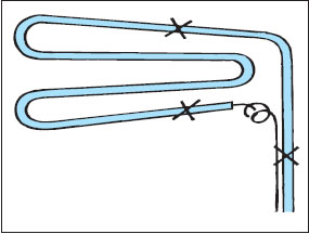 Если перегорел основной предохранитель, необходимо найти причину неисправнос-ти. Чаще всего это может быть следствием дефекта в обмотках электродвигателя или в устройстве защиты двигателя, замыкания на раму или большого тока в подво-дящих проводах, который также ведет к выходу из строя основного предохранителя. Если не включается электродвигатель компрессора, всегда начинайте поиск неисправности с проверки сопротивлений. Во всех компрессорах основная и пусковая обмотки располагаются так, как показано на рисунке справа. Значения сопротивлений указываются производителем компрессоров в соответствующей технической литературе.