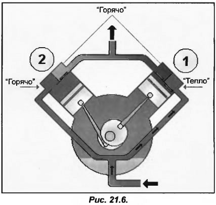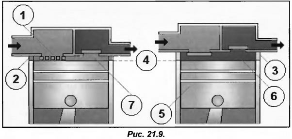 В другом случае, при разрушении клапана нагнетания (поз. 3), после остановки компрессора давление во всасывающей магистрали будет медленно увеличиваться из-за дегазации масла, пока не сравняется с давлением в нагнетательной магистрали. В любом случае НД устанавливают на картере под поршнем, а при разрушении клапана всасывания — и над поршнем. При разрушении клапана нагнетания над поршнем устанавливают ВД. Поскольку поршень не имеет жестких соединений с цилиндром, мы можем считать, что пары ВД будут проникать в поршень (рис. 21.8).