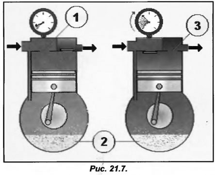 Допустим, что при осмотре разрушенного клапана всасывания (поз.1 рис. 21.9) ремонтник случайно повредил пластинчатую клапанную прокладку (поз.2). Прокладки нужной толщины у него под рукой не оказалось, в связи с чем он решает изготовить ее из имеющегося более толстого материала, чем было изначально (поз. 3), и запускает установку.