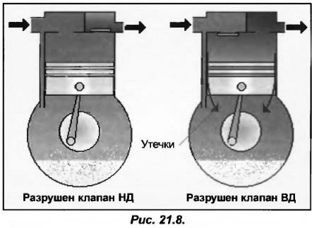 Естественные утечки газа между поршнем и цилиндром, в случае разрушения клапана, приводят к подъему НД. Стоит отметить, что его подъем происходит быстрее, при плохой герметичности поршневых колец. Таким образом, по скорости подъема НД можно судить об их состоянии.