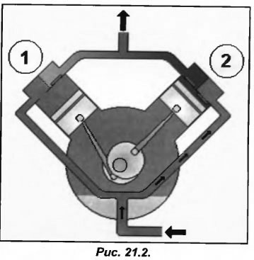 Основным последствие разрушения клапанов является резкое снижение холодопроизводительности компрессора, связанное с уменьшение расхода всасываемого хладагента. Для большей наглядности рассмотрим поломку всасывающего клапана (поз. 1 рис. 21.2) компрессора, состоящего из двух цилиндров.