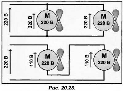 Если для нормальной работы испарителя предусмотрено два однофазных вентилятора, то их соединение должно быть параллельным. В этом случае они будут запитаны напряжением 220 В и будут стабильно работать. Если при монтаже ошибочно их соединить последовательно (рис. 20.23), то каждый из них получит напряжение в 110 В. Уменьшение напряжения питания вентиляторов, станет причиной сильного падения скорости их вращения, следовательно, и снижения расхода воздуха, что в итоге будет характеризоваться как признаки «слишком слабого испарителя».