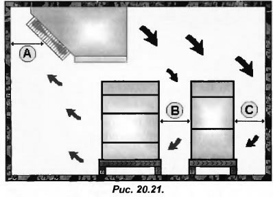 Основным фактором стабильной работы холодильной камеры является хорошая циркуляция воздуха, обеспечивающая хорошее охлаждение продуктов. Когда испаритель расположен близко к стенке (рис. 20.21) происходит затруднение всасывания воздуха, что может привести к снижению его расхода. Если продукты расположены близко друг от друга (положение В рис.20.21) или возле стены (положение С рис.20.21) циркуляция воздуха затрудняется. В свою очередь, плохое охлаждение продуктов приводит к снижению расхода воздуха через испаритель.