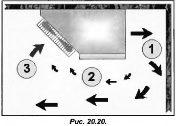 При монтаже холодильного оборудования особое место уделяют установке испарителя. В первую очередь, необходимо строго следовать инструкции, прилагаемой производителем, и перед тем как крепить испаритель, определить направление движения воздуха. Если испаритель расположен близко к стене (рис. 20.20), то поток холодного воздуха, вышедшего из него (поз. 1) может отражаться от стенки и заново попадать на вход (поз.2) не циркулируя по всему объему камеры. Вместо этого он смешивается с теплым воздухом (поз. 3) и попадает на вход в испаритель понижая температуру. Полный перепад температур остается практически неизменным, но температура кипения снижается, и наблюдаются признаки неисправности «слишком слабый испаритель». Вместе с этим плохая циркуляция воздуха в холодильной камере снижает температуру охлаждения скоропортящихся продуктов.