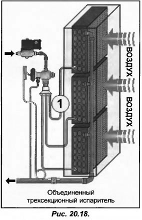 При повышении холодопроизводительности испарителя, конструктор должен предусмотреть увеличение поверхности теплообмена и длины трубок. Конечно, большая длина является неудобной, поскольку вместе с их длиной растут и потери давления. Для их сохранения разработчик применяет несколько параллельно соединенных испарителей, представленных в виде единой конструкции. Подобного рода конструкция должна подпитываться жидкостью через распределитель, который обеспечивает равномерное распределение жидкости по различным секциям испарителя. На рис.20.18 представлен испаритель, состоящий из трех секций. Одна из трубок питания закупорена, что исключает его работу и приводит к потере холодопроизводительности на 1/3. Установка работает на 2/3 мощности и обеспечивает небольшой перепад температур воздуха. На первый взгляд, можно подумать о засорении, несмотря на нормальное состояние оребрения.