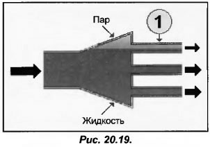 На рисунке 20.19 мы видим, что две нижние трубы запитаны нормально и паровая подушка образовалась в верхней части, и мешает свободному прохождению жидкости (поз. 1). В результате данная секция не полностью заполнена жидкостью, и испаритель не сможет обеспечить максимально возможную холодопроизводительность.