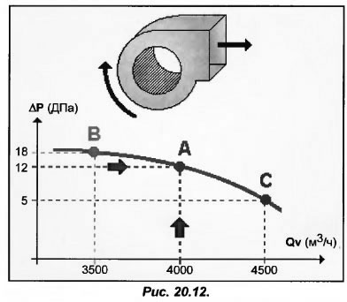 Вначале рассмотрим, что происходит в центробежных вентиляторах, когда меняются потери давления в воздушном тракте испарителя. Для наглядности приведем пример с кривой (рис.20.12). Кривая отображает зависимость объемного расхода в воздушном тракте (Qv) от потерь в нем давления. Воздушный тракт включает центробежный вентилятор, воздушный фильтр, заборную решетку, испаритель и воздуховод. Допустим в номинальном режиме потери давления (ΔP)в тракте составляют 12 ДПа, а расход воздуха равен 4000 м3/ч (точка А).
