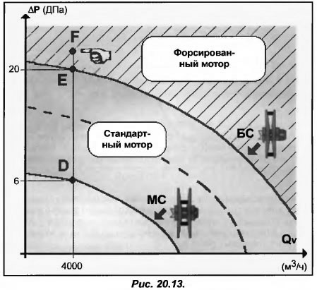 Если же потери давления выше 20 ДПа при расходе 4000 м3/ч, мотор с регулируемым шкивом не обеспечивает достижение рабочей точки на расходной кривой (точка F), даже если его отрегулировать на максимальное количество оборотов.