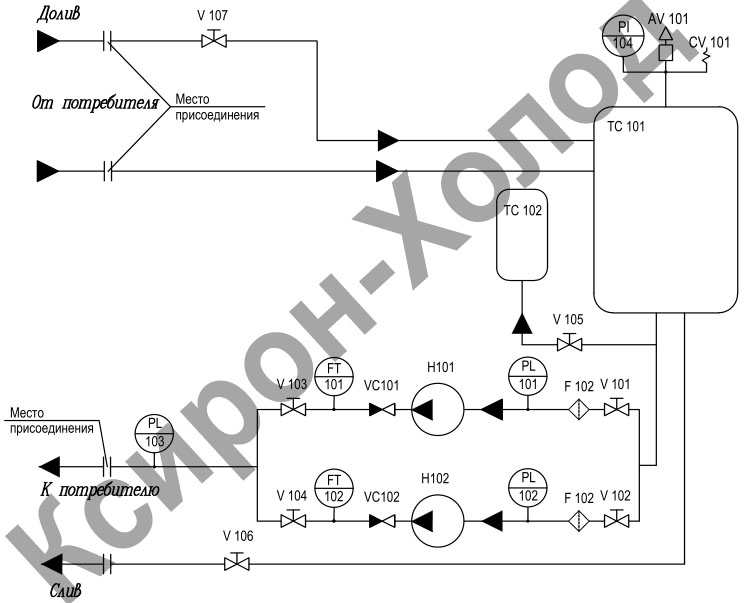 Дополнительные опции по запросу: Например, реле протока, емкость из нержавеющей стали, элементы для работы с жидкостями низких температур и т.д. Стандартная схема гидромодуля На схеме ниже изображен гидромодуль с расширительной емкостью и двумя насосами. Один рабочий, второй резервный с автоматическим переключением. Буферная емкость в данной комплектации отсутствует. TC 102 Расширительный бак; AV 101 Воздухоотводчик; CV 101 Предохранительный клапан; TC 101 Герметичная емкость; FT 101-102 Реле протока; H 10-102 Насос; VC 101-102 Обратный клапан; V 101-107 Шаровый кран; Pl 101-102 Мановакуумметр; Pl 103-104 Манометр; F 101-102 Фильтр. Принцип работы гидромодуля Гидромодуль обеспечивает непрерывную, контролируемую и безопасную циркуляцию теплоносителя в системе охлаждения, улучшая эффективность чиллера и обеспечивая надежность всей системы. Выделем основные принципы работы гидромодуля: - Циркуляция теплоносителя: В основе работы гидромодуля лежит циркуляция теплоносителя (чаще всего воды или водно-гликолевой смеси) между чиллером и потребителями холода. Теплоноситель забирает тепло от потребителей и передает его чиллеру, где оно рассеивается в окружающую среду.
