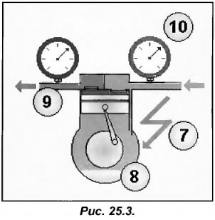 Во время цикла сжатия газа объем энергии, передаваемой двигателем компрессору, будет зависеть от величины давления нагнетания, препятствующего подъему поршней в цилиндрах. Имеющиеся неконденсирующиеся примеси провоцируют рост давления нагнетания и электромотору необходимо снабжать компрессор большей энергией, следовательно, и потребляемый им ток станет больше (поз.7 рис.25.3).