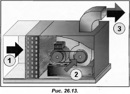 Подобного рода дефект может возникнуть независимо от типа используемого вентилятора и его расположения. В данном случае будем рассматривать центробежный всасывающий вентилятор (рис. 26.13).  При стабильной работе установки весь поток воздуха выходит из короба вентилятора (точка 3), который предварительно прошел через конденсатор (точка 1). Если между ними возникает дополнительный приток воздуха (негерметично закрыта панель воздуховода, нарушена целостность уплотнительной прокладки и пр.), то его часть всасывается вентилятором в обход конденсатора (точка 2).