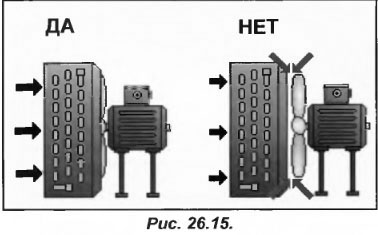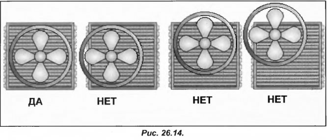 Поскольку циркуляция воздуха через конденсатор осуществляется при помощи осевого вентилятора, то его расположение должно соответствовать геометрическому центру.  Встречаются ситуации, корда вентилятор оказывается смещенным от центральной оси конденсатора (рис. 26. 14), причем не важно, произошло это в горизонтальном или вертикальном направлении. В том и другом случае значительная часть поверхности теплообмена конденсатора находится вне основного потока (известны случаи когда приводной ремень слишком длинный или короткий).