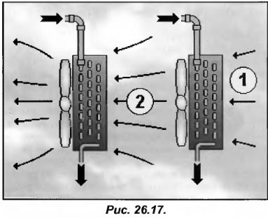 Нагретый воздух также может попадать на вход в конденсатор, если несколько конденсаторов установлены друг за другом. Тогда воздух, выходящий из одного конденсатора, попадает на вход другого. Так, на рис. 26.17 изображено два последовательно установленных конденсатора. Первый всасывает воздух с нормальной температурой, что обеспечивает нормальное давление конденсации. Но, поскольку второй установлен очень близко, то он поглощает часть воздуха из первого конденсатора.