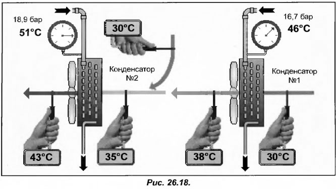 Сравнив полученные данные, мы видим, что в контуре второго конденсатора давление аномально возросло при незначительном переохлаждении. Неопытный ремонтник может сделать вывод о том, что конденсатор слишком слабый и не обратить внимания на попадание нагретого воздуха из первого конденсатора во второй.