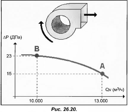 Если конденсатор воздушного охлаждения располагается в нижней части здания, то для подвода к нему наружного воздуха и удаления нагретого применяют специальные воздуховоды. При этом возможны потери напора, иногда и значительные, поэтому в сети воздуховодов применяют центробежные вентиляторы. Рассмотрим на примере зависимость расхода воздуха от потерь давления (рис. 26.20) с учетом использования в установке центробежного вентилятора и конденсатора воздушного охлаждения. При расчетных потерях 15 декапаскалей (ДПа) нужный расход вентилятора составляет 13000 м3/ч (точка А).