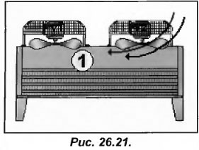 Чем выше мощность конденсатора, тем больше его размеры. С увеличением габаритов появляется необходимость установки нескольких вентиляторов, которые смогут обеспечивать необходимый поток воздуха.  Рассмотрим пример (рис.26.21), где конденсатор оборудован двумя осевыми вентиляторами V1 и V2. Как только наружная температура повышается, они начинают одновременно работать. Допустим, если V2 по какой-либо причине перестал работать, а V1 функционирует нормально, то расход воздуха, который служит для обдува конденсатора, резко снизится