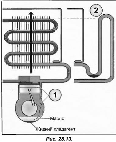 По своей структуре хладагент плотнее масла, поэтому его слой будет всегда находиться ниже. Так, при запуске компрессора, резкое снижение давления в картере будет приводить к вскипанию жидкого хладагента. Пузырьки, вызванные бурным кипением, проходят через слой масла, насыщаясь ним и захватывая за собой большое количество масляных капелек в виде суспензий (рис. 28.11).