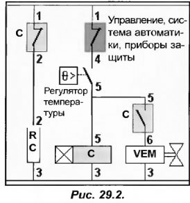 Рассмотрим одну из таких схем (рис.29.2), именуемую «minimum protection». Когда температура окружающей среды примет значение, заданное термостатом, контакты (4-5) разомкнуться, обесточив обмотку контакта компрессора С (5-3) и установленного на жидкостной магистрали электромагнитного клапана VEM (6-3). При остановке компрессора контакт С (1-2) замкнется и напряжение поступит на электронагреватель картера RC (2-3). При повторном повышении температуры термостат снова замкнет контакты (4-5). Когда замыкаются контакты автоматики, системы безопасности и управляющие контакты, компрессор запускается и электроклапан VEM открывается. Вместе с этим контакты С (1-2) размыкаются и электронагреватель картера обесточивается.