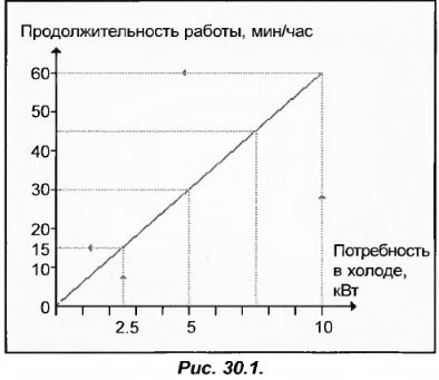 Предположим, что если заданная потребность в холоде составляет 5 кВт, то период работы компрессора будет равняться 30 мин. Теперь у нас имеется три точки, по которым можно провести прямую, отображающую зависимость работы компрессора от потребности в холоде.