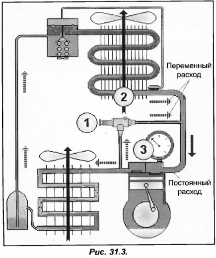 При данном способе подключения регулятор производительности (поз.1 рис.31.3) устанавливают между патрубками нагнетания и всасывания компрессора. При высокой температуре воздуха на входе в испаритель (поз.2) давление кипения (поз.3) высокое. Компрессор работает на полную мощность, чтобы удержать регулятор в закрытом положении.