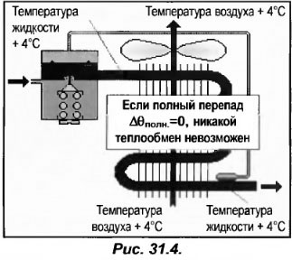 - увеличение температуры кипения снижает температурный перепад между хладагентом и поступающим на вход в испаритель воздухом. Это также снижает холодопроизводительность, поскольку интенсивность теплообмена ухудшается (рис. 31.4).