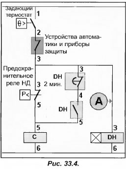 Рассмотрим схему такого устройства (рис.33.4). При замыкании контактов (1-2) задающего термостата (контакты устройств автоматики, управления и приборов защиты замкнуты), ток, минуя контакты (2-3), запитывает реле зимнего запуска DH (3-6), включая временный механизм. В это время контакты DH (4-5)размыкаются, а контакты временного механизма DH (3-4) остаются замкнутыми в течении двух минут, шунтируя предохранительное реле НД.
