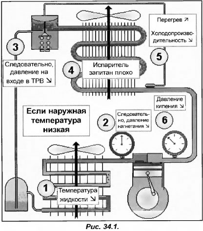 Поскольку на входе в ТРВ давление слишком низкое и испаритель плохо запитывается, то давление кипения вместе с холодопроизводительностью становятся слишком низкими (рис.34.1). Давление конденсации (давление подачи в ТРВ) увеличится только в том случае, когда конденсатор получит максимальное количество тепла.